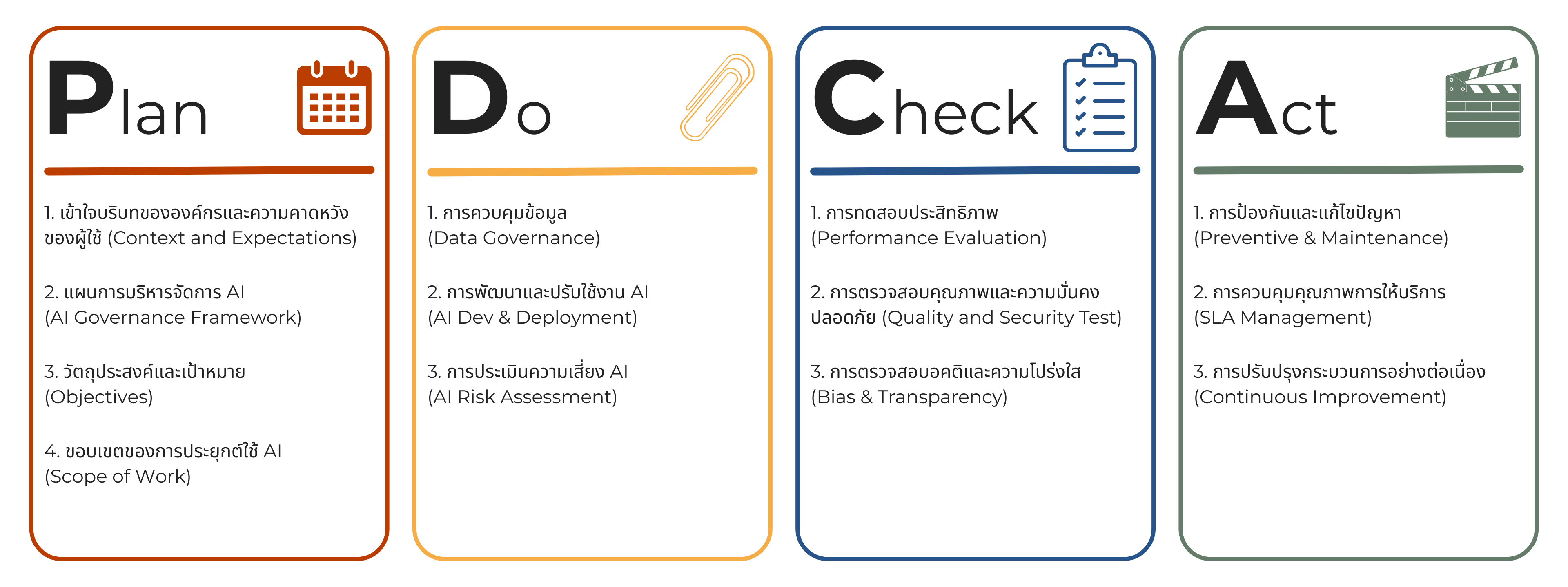 4. การปรับปรุง (Act) ประกอบด้วยการป้องกันและแก้ไขปัญหาที่อาจจะเกิดขึ้นจากการใช้งาน AI (Preventive & Maintenance) การควบคุมคุณภาพการให้บริการ AI ให้อยู่ในระดับที่ตกลงกับผู้ใช้งาน (SLA Management) และการปรับปรุงกระบวนการอย่างต่อเนื่อง (Continuous Improvement) เนื่องจากการใช้งาน AI อาจจะพบกับ use case ใหม่ จำเป็นต้องนำข้อมูลไปเรียนรู้โมเดลเพิ่มเติมอย่างต่อเนื่อง